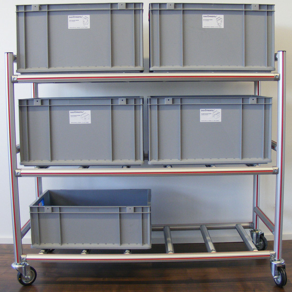 Die Wagen können außerhalb der Produktion bestückt werden und dann dem Werker mit allen notwendigen Bauteile am Arbeitsplatz bereit gestellt werden