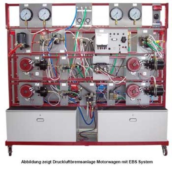 Gerätebeschreibung:Kaum ein anderes Gebiet der Nutzfahrzeugtechnik hat sich in den letzten Jahren so verändert wie die Druckluftbremssysteme.EBS (Elektronisches Bremssystem) integriert die Grundfunktionen Bremssteuerung, ABS und ASR in einem einzigen System und zeichnet sich besonders durch Wirtschaftlichkeit, Sicherheit und Innovation aus. Alle wesentlichen EBS-Komponenten wie Bremswertgeber, Steuergerät, Proportionalrelaisventil, Achsmodulator, Anhängersteuerventil, digitale Datenschnittstelle zu EBS-Anhängern, Redundanzventil, sämtliche Sensoren sowie alle weiteren Bremskomponenten sind am Schulungsstand modular und voll funktionsfähig aufgebaut.Der elektrische Antrieb der Vorder- und Hinterachse kann wahlweise erfolgen. Somit ist mit der im Lieferumfang enthaltenen Software eine komplette Inbetriebnahme (auch im Klassenraum oder Werkstatt) wie am Original LKW möglich. Das System verfügt zusätzlich über eine Schnittstelle für den Anschluss eines Fehlerschaltgerätes, mit dem unterschiedliche Fehler elektronisch aufgeschaltet werden können.