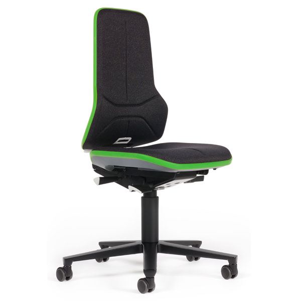 Ausführung und Material:Bei ESD Neon sind sämtliche Kunststoff- und Metallteile schwarz. Der Grund hierfür liegt in der Ableitfähigkeit, die bei jedem Bauteil von Neon gegeben ist. Hierfür werden auch Kunststoffe mit Kohlenstoffpartikeln versetzt und damit leitfähig gemacht. Das wohl auffälligste Merkmal ist das Flexband. Dieses besteht aus weichem Kunststoff und schützt den Stuhl ebenso wie dessen Umgebung. Es stehen drei Flexband-Farben zur Auswahl. Der Stuhl selbst besteht aus einer massiven Stahlkonstruktion mit Aluminiumfußkreuz. Neon ist wahlweise mit lastabhängig gebremsten Rollen für harte Böden oder abriebfesten Bodengleitern lieferbar.Für die hohe Ausführung stehen außerdem die optionalen Sitz-Stopp-Rollen zur Verfügung. Sämtliche Gleiter und Rollen sind volumenleitfähig.