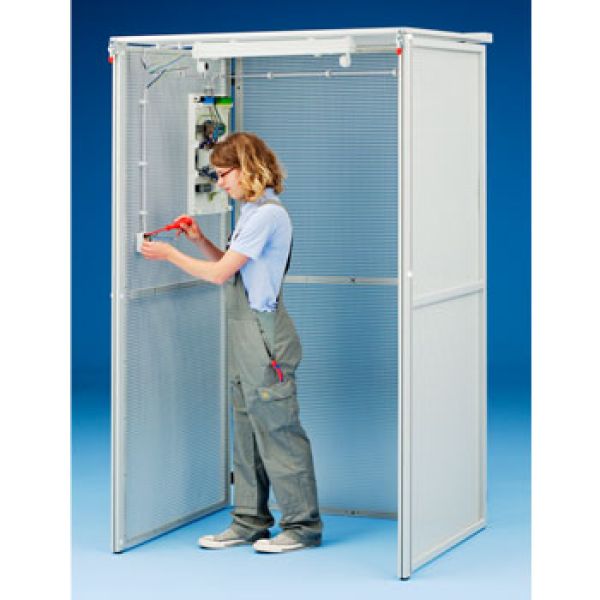 Die Kabine besteht aus zwei Seitenwänden, einer Rückwand und einem Dach, die jeweils als Lochblech ausgeführt sind