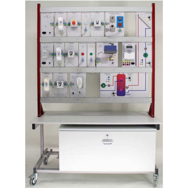 Bauplattensatz Grundlagenelektrik, Bauplattensatz Solarspeicher, 2 x Spannungsversorgung 230V/24V-AC, 1 x Solarregler, 3 x FI-Schalter, 1 x Solarkollektor, 3 x Sicherung, 1 x Zirkulationspumpe, 3 x Kontrollleuchte, 1 x Solarspeicher, 1 x Gitterleuchte, 1 x Kabelsatz mit Sicherheitsstecker, 4 x Schalter, 1 x motorischer Kugelhahn mit Lagenrückmeldung, 1 x Heizkessel mit STB, Thermostat, Heizelement, 1 x Kabelsatz für Federklemmen, 1 x Experimentierstand, fahrbar, 3-zeiliger Montagerahmen, abschließbarer Systemplattenschrank