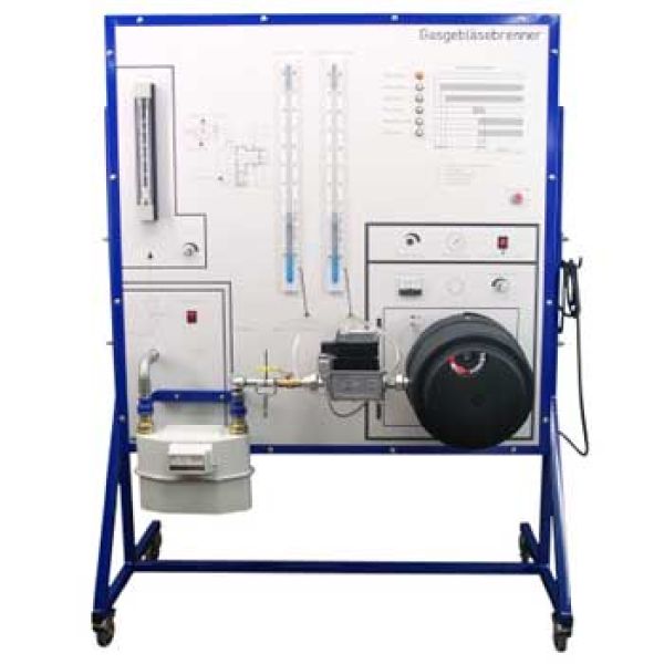 Gerätebeschreibung:Der sichere Umgang mit Gasheizanlagen und deren korrekte Einstellung entsprechend dem vorhandenen Wärmebedarf erfordert Übung. Unter normalen Umständen sind diese Einstellübungen an Praxis-Heizanlagen nur schlecht möglich.Die Gefahren bei unsachgemäßem Umgang mit Brenngasen erlauben kaum ein freies Experimentieren oder das bewusste Herbeiführen von Störungen.Beim Schulungsstand HTB 5 treten keine Sicherheitsprobleme auf, da anstelle von Brenngas, mit Luft als Betriebsmittel für alle Einstellübungen gearbeitet wird. An dem Gerät finden Sie alle Baugruppen einer Gebläsebrenner-Installation, bestehend aus Gasbalgenzähler, Kugelventil, Kompaktgasstrecke und Gasgebläsebrenner. Der Netzanschlussdruck ist stufenlos regelbar. Die wichtigen Drücke im System (Netzeingangsdruck, Druck hinter dem Regler) können an Rohrmanometern abgelesen werden. Zur vergleichenden Gasdurchsatzmessung ist zusätzlich zum Gasbalgenzähler ein Schwebekörperdurchflussmesser vorhanden. Die mit der Stoppuhr am Balgenzähler ermittelte momentane Durchflussmenge kann am Schwebekörpermessgerät sofort überprüft werden.Der Programmablauf des Zündsteuerrelais wird auf einer Großanzeige sichtbar gemacht. Das Ansteuern der einzelnen Baugruppen am Brenner (Druckwächter, Magnetventil, usw.) wird durch zusätzliche Signallampen innerhalb des Schaubildes gezeigt.Zur Berechnung der Einstellmenge in Abhängigkeit von Höhenlagen, Gasart, Fließdruck und Wärmebedarf finden Sie auf der Frontplatte einen Mikrocomputer.Neben der reinen Bauteilekunde ist das Einstellen der Nennlast eine wesentliche Übung, die sehr anschaulich und praxisnah durchgeführt werden kann. Nach Vorgabe der Rahmenbedingungen wie Wärmebedarf, Gasart, Heizwert usw. soll der Schüler alle notwendigen Einstellungen vornehmen. Durch Messen der Drücke und Drucksätze wird die Nennlast überprüft.Durch den Lehrer lassen sich auch Fehlfunktionen einstellen, z.B. Druckwächter zu hoch oder zu niedrig usw., die der Schüler dann finden muss.