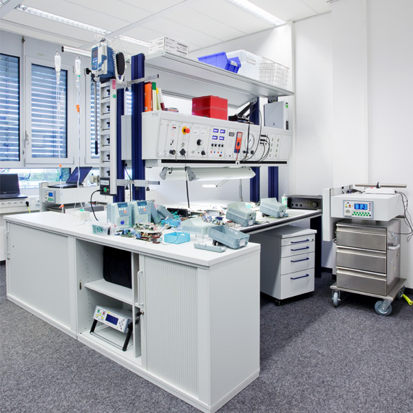 Durch die Kombination von Arbeitsplätzen, Aufbewahrungseinheiten, passenden Rollcontainern und Mobilen werden komplette medizintechnische Labors verwirklicht