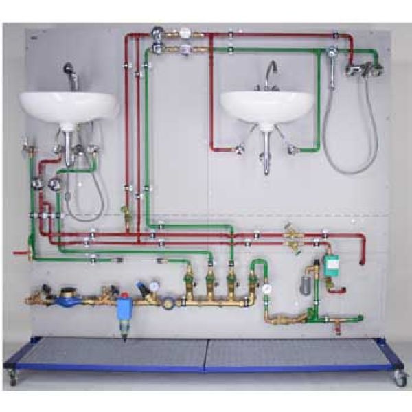 Gerätebeschreibung:Fahrbarer Schulungsstand mit gravierter Melamin-Kunstharzplatte. Aufbau einer Trinkwasserinstallation nach DIN 1988, wie sie in Haushalten vorzufinden ist. Der rückseitig angebrachte Warmwasserspeicher und die Zirkulationsleitung zeigen mit den verbauten Komponenten die Brauchwassererwärmung des eingespeisten Kaltwassers.Sicherungseinrichtungen zeigen, wie Trinkwasserinstallationen vor Rücksaugen des Schmutzwassers in die Trinkwasserleitung geschützt werden. Auf der Rückseite der Tafel befindet sich ein Rohrsystem zur Abwasserableitung.Das aufgebaute Rohrsystem mit Armaturen ist für folgende Themenbereiche ausgerüstet: