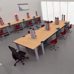 Die Kombination von sechs Arbeitsplätzen in einer Werkbank ist so beispielsweise besonders platzsparend und optimal geeignet für eine effiziente Raumgestaltung.