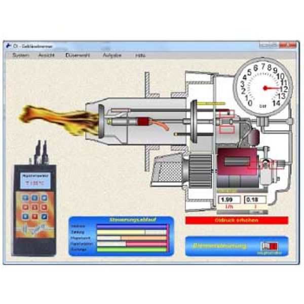Programmbeschreibung:Das Simulationsprogramm Heizöl-Gebläsebrenner ermöglicht die Durchführung von Inbetriebnahme-Einstellübungen direkt am PC und vermittelt die Grundzusammenhänge bei der Lasteinstellung und deren Optimierung bezüglich der Abgaswerte und des Wirkungsgrades.Für die Versuche stellt das Programm einen modernen Ölgebläsebrenner (mit Ölvorwärmung und Luftklappe) zur Verfügung, an dem die Luftmenge und der Öldruck beliebig eingestellt werden können. Zur Abdeckung eines breiteren Lastbereiches lassen sich zusätzlich 5 verschiedene Düsen einsetzen.Für die messtechnische Erfassung der Abgaswerte ist ein Abgasmessgerät (C02, O2, Abgastemperatur, Rußzahl, usw.) und für den Öldurchsatz ein Ölmengenzähler vorhanden.Die Öldruckeinstellung erfolgt mit einem Manometer, welches eingeblendet wird, wenn an der Öldruck-Einstellschraube der Pumpe ´gedreht´ wird.Zur Verdeutlichung des Steuerungsablaufs beim Brennerstartvorgang, kann eine Zeit/Funktions-Anzeige auf dem Bildschirm platziert werden.Das Programm kann auch zur Vorgabe von einzustellenden Kesselbelastungen und deren anschließender Bewertung verwendet werden.Die gewählten Einstellwerte lassen sich als Protokoll ausdrucken.