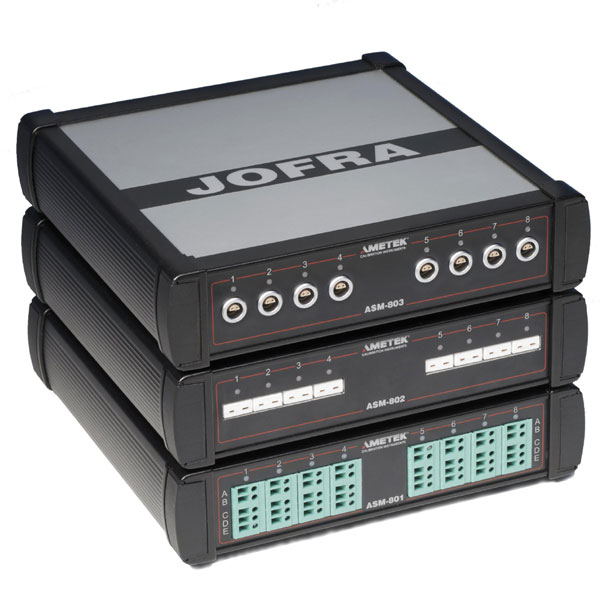 Jofra ASM - Funktioneller Signal-MultiscannerDie ASM Serie (Advanced Signal Multiscanner) bietet eine einzigartige Zeitersparnis und automatische Lösung für die gleichzeitige Kalibrierung mehrerer Temperatursensoren. Die ASM Serie ist ein 8- Kanal Scanner, welcher mittels PC und der JOFRACAL Software angesteuert wird. Bis zu drei ASM Einheiten können zusammengeschlossen werden, um bis zu 24 Sensoren zur gleichen Zeit zu kalibrieren. Folgende Signale können verarbeitet werden: 2-, 3- und 4- Leiter RTD’s, TC’s, Transmitter, Thermistoren, Temperaturschalter und Spannung. Wo auch immer Temperaturmessungen kritisch sind und/oder eine rückführbare Kalibrierdokumentation benötigt wird: Nutzen Sie die ASM800 Serie. Leicht, flexibel und zeitsparend! Der ASM Multiscanner ist mit jedem Trockenblock-Kalibrator oder Flüssigkeitsbad kombinierbar. Zudem kann ein DTI Referenzthermometer oder gar ein ASC300 Signalkalibrator genutzt werden, welches eine weitere Werterhöhung für die vorhandene Ausrüstung bedeutet. ModelleDen ASM Multiscanner gibt es als A und als B Modell. Das ASM B Modell ist die Komplettlösung mit integriertem Scanner und hochgenauen Mehrfachsignal-Messkreisen. Das ASM A Modell ist günstiger und erweitert ein vorhandenes Gerät um acht Kanäle mit Scan-Eigenschaft. Dadurch benötigt das A Modell die Meßeigenschaften von einem Trockenblock ATC B Modell, einem ASC300 Signalkalibrator, einem DTI-1000 Referenzthermometer oder einem ASM B Modell. ApplikationenDer ASM-800 passt in eine Vielzahl von Prozessindustrien und besonders in die Pharmazie sowie in Öl-, Gas- und Kraftwerksanlagen. Auch OEM’S profitieren von der Kalibrierung und Dokumentation mehrerer Temperatursensoren vor der endgültigen Installation.