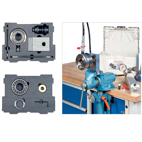 Trainingssystem zur hydraulischen Montage und Demontage eines Pendelrollenlagers mit kegeliger Bohrung, im Kunststoffkoffer, bestehend aus: